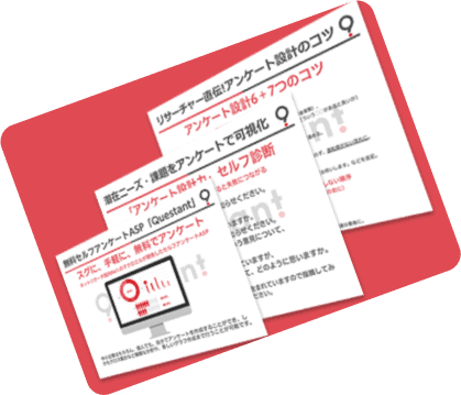 Questantのサービス説明に加えて、「調査設計時のよくある落とし穴」「リサーチャー直伝のアンケート設計7つのコツ」「アンケート設計力セルフ診断」などのお役立ち情報が詰まった資料を提供しています。